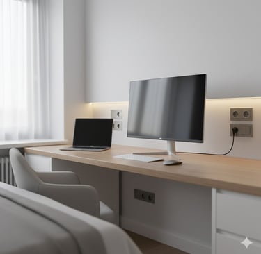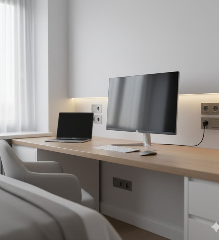Oferecemos a adequação elétrica completa para home office, com aumento e reposicionamento de tomadas, circuitos dedicados e instalação de pontos de rede cabeada, garantindo uma conexão mais estável e confiável do que o Wi-Fi. Tudo isso é feito com planejamento técnico, seguindo as normas elétricas e priorizando um acabamento limpo, discreto e elegante, integrando a infraestrutura ao ambiente do cliente.
